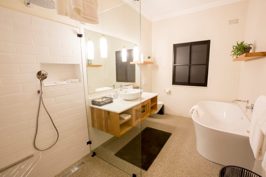 2 suites include an indoor shower and a bathtub (no outdoor shower). All bathrooms are equipped with a vanity unit with a basin and a mirror. A built-in corner bench in the indoor showers. Guest amenities for added comfort.